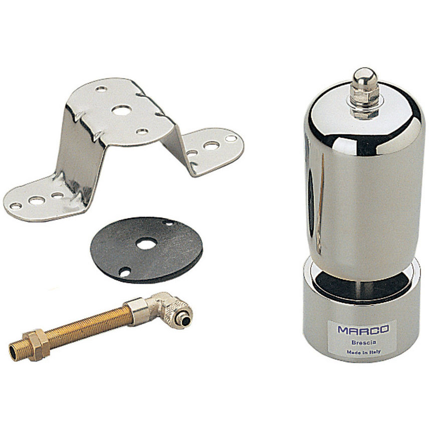 Fischio originale del treno, costruito interamente in ottone cromato. Funzionamento con aria compressa minimo 8 bar. Staffa di fissaggio in acciaio inox. Raccordi per tubo da 8 mm diam. esterno, valvole escluse.